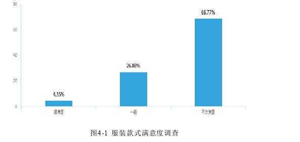 在面向医护工作者的调查问卷中,如图4-1所示的调查结果,对于目前的中医院服装款式,68.77%的医护工作者表示不满意,4.35%的表示很满意,26.88%的人则持中立的态度。