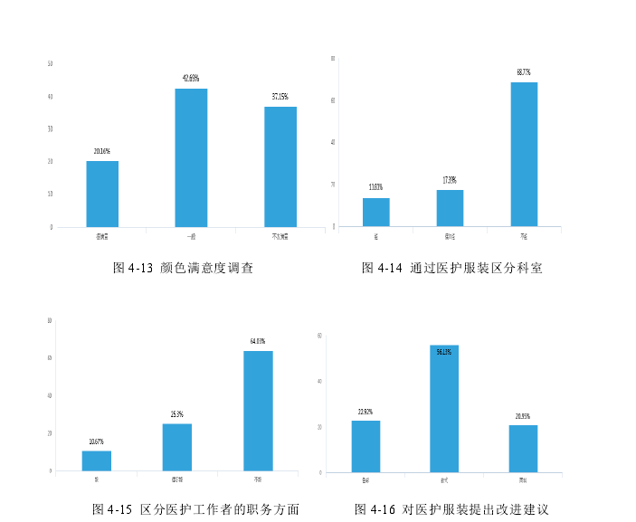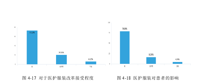 在对该院院服哪一方面印象较为深刻进行调查时,如图4-12的调查结果显示,47. 04%的人表示印象深刻是中医院的服装款式,44.27%的人表示印象深刻的是中医院医护服装的颜色,对于面料的关注只占总人数的8.7%;对颜色满意度调查调查时发现,20.16%的人表示很满意现在中医院医护服装的颜色,37.15%的人则表示不满意,42. 69%的人则持中立态度,如图4-13所示;对于能否根据医护服装来区分科室方面,调查结果如图4-14,表示不能的人数占68.77%,17.39%的人表示偶尔能;对于能否根据医护服装,来区分医护工作者的职务方面,64.03%的人表示不能,只能通过胸前挂着的名片进行职务识别,如图4-15所示;对于中医院医护服装改进方面提出的建议方面,调查结果如图4-16,56.13%的人希望能款式上有所变化,22.92%的人表示希望服装的颜色能有所改善,20.95%的人表示希望服装的面料能有所变化,结果显示更多的人还是比较在意的款式的设计;对于能否接受中医院医护服装款式的改良,73.12%的人表示能够接受,如图4-17所示;关于医护服装对患者的影响方面(如图4-18 ),74.7%的人表示医护工作者的着装,对于患者和病情有着重要的影响;79.05%的人表示医护人员的着装,对于提高患者信任感、医患沟通方面有着重要的影响,结果表明,医护人员的着装对于患者来说是十分重要的。