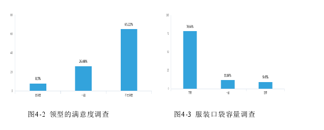 如图4-2所示,对于领型的满意度调查结果显示,其中65.22%的人表示不满意,仅8.3%表示很满意,26.48%的人持中立的态度。表示很满意占比较小。