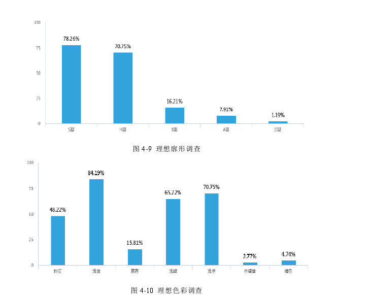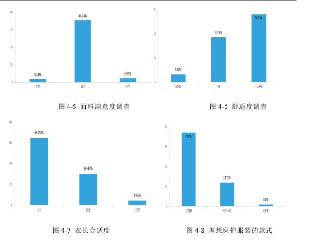 对于服装口袋容量的调查中,78.66%的人表示不够用,9.49%表示足够,11.86%的人持中立态度(如图4-3 );对于医护服装的颜色满意度调查中(如图4-4 ),65.61%的人表示不满意,13.44%的人表示很满意,20.95%的人则表示不满意;在对于面料以及穿着舒适度调查时,发现5.93%的人表示医护服装面料太厚,88.93%的人表示面料适中(如图4-5 );对于舒适度方面的调查(如图4-6 )发现56.13%的人表示穿着不太舒适,6.72%的人表示穿着舒适;关于衣长方面(如图4-7 ),65.22%的人表示衣服过长,30.43%的人表示合适;对于未来医护服装的款式(如图4-8 )、廓形和色彩期许中,23.72%的人希望是大衣一体式,74.7%的人希望是上下套装,廓形调查中(如图4-9 ) 78.26%的人希望是S型,70.75%的人希望是H型,如图4-10所示,色彩方面期待颜色最多的是浅蓝色、浅紫色和浅绿色等浅色调。