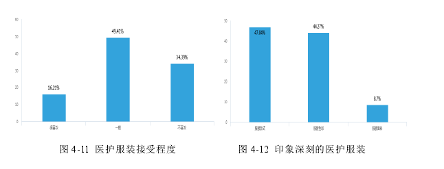 如图4-11所示,在面向社会群体调查进行该院医护服装接受度调查时发现,数据显示,49.41,不超过半数的人觉得目前河北省中医院的医护服装一般,而34.39%的人则明确表示不喜欢,结果表明在所有被调查者中对于该院服饰的接受度较低。