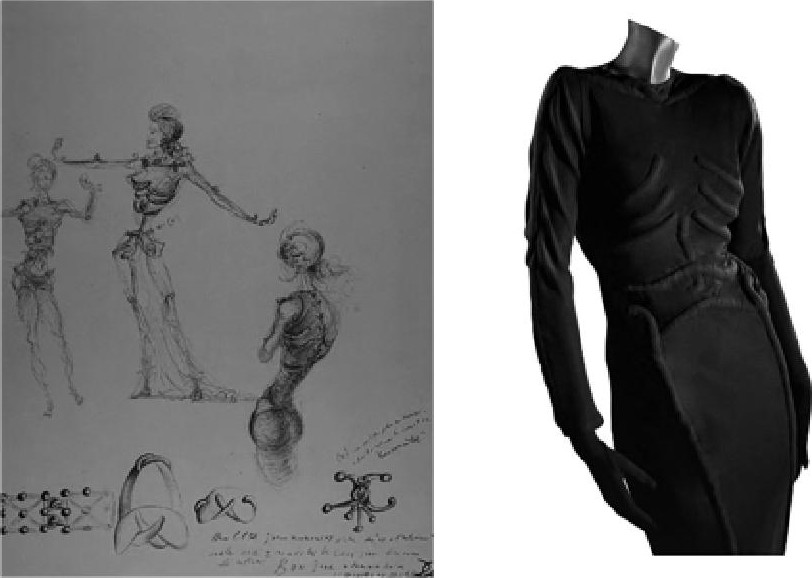 图6 达利的手稿与夏帕瑞丽设计的“骨骼裙”