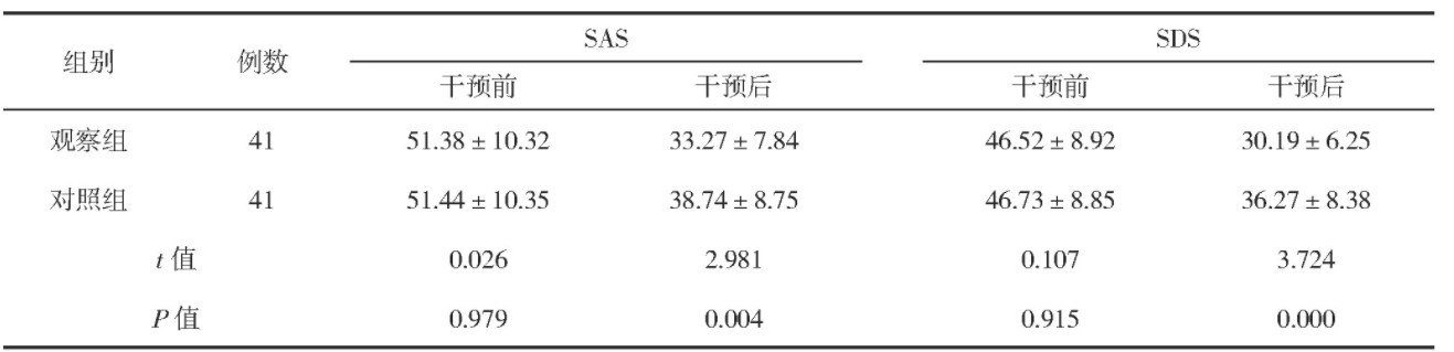 干预前,两组SAS、SDS评分比较差异无统计学意义(P>0.05);干预后,观察组SAS、SDS评分均明显低于对照组,差异有统计学意义(P<0.05),见表2。