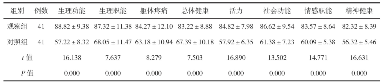 干预后,观察组SF-36各维度评分明显高于对照组,差异有统计学意义(P<0.05),见表1。