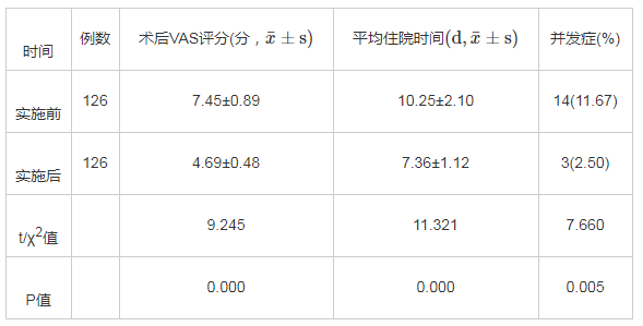 骨科患者病情复杂多样,导致护理难度较大,对护理质量要求较高,提高骨科护理服务质量将有助于降低患者围手术期并发症,促进患者术后康复。但护理质量水平高低不仅与护理人员素质有关,还与护理管理方法有关[5]。个案护理管理方案通过成立个案管理小组指导责任护士有目的开展护理工作,从而提高护理服务及护理服务满意度[6]。本研究对骨科患者实施个案护理管理,结果显示实施后骨科患者术后VAS评分低于实施前,平均住院时间短于实施前,并发症发生率低于实施前,表明个案护理管理模式能有效降低骨科患者术后并发症,改善患者预后。考虑可能由于个案护理管理模式密切关注患者术前健康教育,通过评估、跟进、督促健康教育落实,确保患者围手术期能获得有效的护理指导,从而提高了患者护理服务质量,有利于患者术后快速康复[7]。另外,个案护理管理小组在术后1~3 d对患者应用VAS评分表对患者术后疼痛感进行评价,通过评价了解患者术后疼痛状况,并给予患者对症治疗,从而有效减轻患者术后疼痛感,有利于患者术后康复。此外,个案护理管理小组通过微信对患者进行随访,使患者出院后仍获得有效的健康指导,从而有利于患者院外康复。