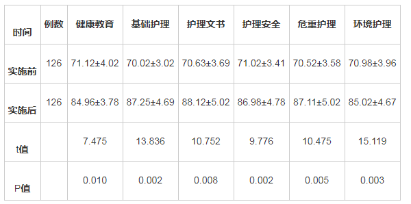 摘要:目的 探讨个案护理管理模式在骨科护理质量中的应用。方法 对本院骨科患者126例实施个案护理管理,比较实施前(2017年1月—2017年12月)及实施后(2018年1月—2018年12月)骨科护理人员综合能力、患者护理质量及护理满意度的变化。结果 实施后骨科患者视觉模拟评分法(Visual Analogue Scale/Score, VAS)低于实施前(P<0.05),平均住院时间短于实施前(P<0.05),并发症发生率低于实施前(P<0.05)。实施后骨科护理人员在健康教育、基础护理、护理文书、护理安全、危重护理、环境护理等方面评分高于实施前(P<0.05)。实施后骨科患者对护理服务态度、基础护理、危急重症护理、并发症预防、住院环境等方面满意度评分高于实施前(P<0.05)。结论 个案护理管理模式能有效提高骨科护理服务质量,降低患者术后并发症,促进患者术后康复,提高患者对护理的满意度。