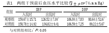 2.1 两组干预前后血压水平比较 出院时观察组SBP以及DBP水平明显优于对照组,差异有统计学意义(P<0.05)。见表1: