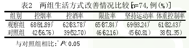 1.2 方法 对照组采用常规治疗及护理措施,观察组在对照组的基础上实施健康教育措施, 在观察组患者住院期间、出院时面对面进行。健康教育措施具体内容如下: ⑴疾病相关知识宣教。在患者入院后,护理人员采用多种形式向患者介绍高血压的防治知识,如面对面宣教、小手册宣传、专题讲座等。重点向患者讲解不良生活方式与高血压发生、发展的密切关系,使患者明确不良生活方式对健康的危害,自觉配合治疗和护理,并养成和保持良好的生活方式。⑵膳食结构指导。指导患者养成良好的饮食习惯,包括低盐、低脂、低胆固醇、高维生素、高纤维素、高钙以及优质蛋白质饮食。尽量保持清淡饮食,多进食新鲜的蔬菜和水果,少吃动物脂肪及高胆固醇食物,尽量食用植物油,避免食用动物油,每天钠盐的摄入量不超过5g[3].由于膳食钙与血压水平呈负相关,因此要增加膳食中钙的摄入量[4].忌饮用浓茶和咖啡,劝导患者戒烟戒酒。⑶运动锻炼指导。指导患者进行适当的运动,根据自身的具体情况选择适合自己的运动方式,如散步、慢跑以及打太极拳等。适当控制体重,提高机体免疫力。⑷用药指导。指导患者按照医嘱用药,不得擅自减量、停药或换药,维持血压的稳定。⑸定期监测血压。指导患者正确使用血压计,并正确的进行测量,记录测量结果。如有异常,可在护理人员随访时咨询,或是来院进行复查,以确保血压保持在正常水平。
