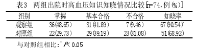 2.3 两组出院时后高血压知识知晓情况比较 观察组出院时高血压知识知晓率明显高于对照组,差异有统计学意义(P<0.05)。见表3: