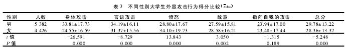2.3 不同性别大学生攻击行为比较 男生倾向于采取“身体及语言攻击”,而女生更易采取于“愤怒及敌意”的攻击行为,但男生的攻击总分高于女生,差异均有统计学意义( P 值均<0.05) .见表 3.