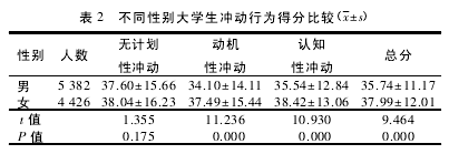 2.2 不同性别大学生冲动行为比较 女生的各项冲动评分及总分均高于男生,其中“动机性冲动”“认知性冲动”及总分差异均有统计学意义( P 值均<0.05) .见表 2.