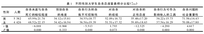 2.1 不同性别大学生自杀行为比较 相对于女生,男生在对“自杀未遂与自杀死亡的相似程度”“自杀行为的自我不可控制性”“对自杀的正性态度”“自杀行为可作为影响他人的工具”分量表倾向于更加否定的态度,差异均有统计学意义( P 值均<0.05) .见表 1.