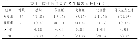 肾脏是糖尿病比较常见的一种靶器官损害,临床上在治疗糖尿病肾病时,血液透析是比较有效的一种方法,也是维持患者生命的一个重要手段。但是由于糖尿病肾病具有并发症多、病程长、死亡率高、病情重、疾病类型特殊等特点,治疗期间,如果护理不当,不仅会影响治疗效果,还会严重影响患者预后,所以对糖尿病肾病的护理模式进行优化有着重大的意义。临床研究资料表明,优质护理对降低并发症发生率、控制血糖水平、稳定血压、延长患者寿命有着极其重要的意义[2].所谓舒适护理,主要指的是根据患者的实际病情,充分考虑到个体差异性,制定针对性护理措施,提高护理质量,从而体现以人为本理念的一种护理模式[3].在本次研究中,观察组的并发症发生率为3.85%,明显低于对照组的23.08%,护理效果显着。由此可见,临床上将舒适护理模式运用在糖尿病肾病血液透析中,不仅可以控制患者病情,还能降低并发症发生率,确保治疗效果。