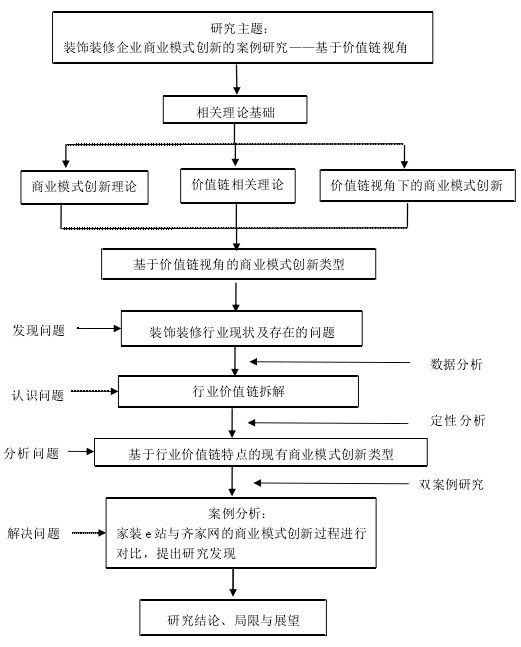 第 4 章,案例研究。通过对案例企业齐家网和家装 e 站的深度研究与对比,分析二者的价值链与商业模式,发觉其相同点与差异,围绕前文研究框架对案例企业的商业模式创新过程加以分析,做出研究发现。