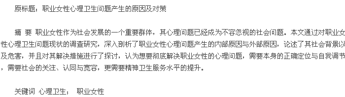 中国人力资源开发网2005年对职业女性进行的调查发现,27. 45%的女性存在心理卫生问题。袁艳萍等人研究调查表明,职业女性群体中28% 经常处于抑郁、压抑状态,24. 4% 经常处于焦虑、烦躁状态;18. 5% 经常出现神经质或者紧张[4].