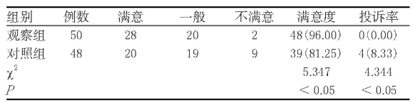 (3)投诉率及护理满意度:采用本院自制满意度调查问卷,内容包含满意、一般和不满意几个选项,对总满意度进行观察。总满意度=(一般+满意)例数/总例数×100%。