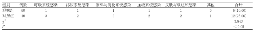 观察组呼吸系统感染、泌尿系统感染、腹部与消化系统感染、血液系统感染、皮肤与软组织感染以及其他等医院感染发生率比对照组更低(P<0.05),见表1。