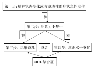 ICU 综合征诊断标准:第一步、第二步均为阳性,且第三步或者第四步为阳性,即可判断发生了 ICU 综合征。